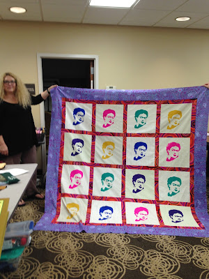 Kim G. made two more Frida Kahlo quilts using her own original silk screens. You can see her first Frida quilt here. Kim made the first quilt as a gift for a friend. Her friend liked it so much that she commissioned Kim to make two more Frida quilts for each of her daughters. Kim even did a little silk screening in the hotel using her bathroom floor as a work surface when she needed a few more blocks. She is so resourceful!
